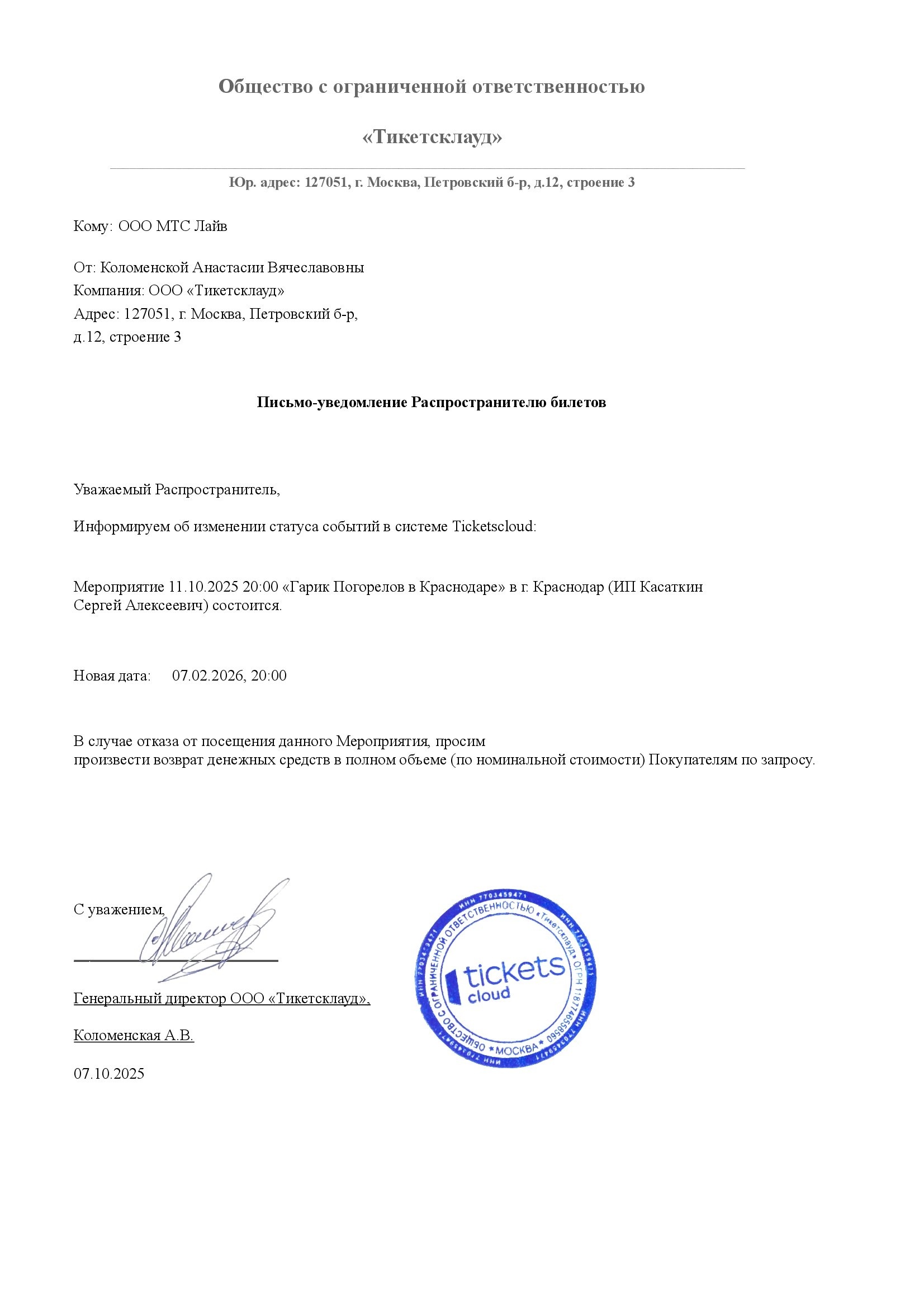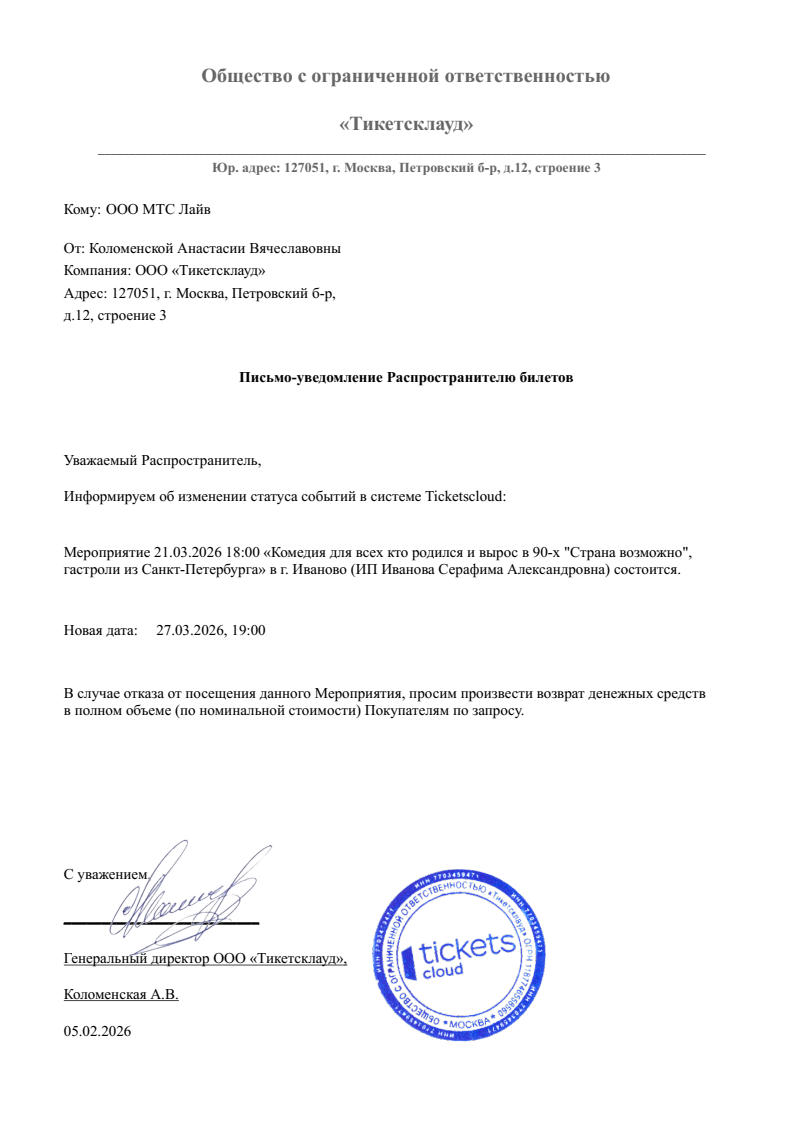 Уважаемый клиент! Спешим сообщить, что по информации, полученной от организатора, концерт Ирины Круг, запланированный на 2 августа 2025 года в 20:00 на площадке «МТС Live Лето», перенесён на открытую дату. Новая дата концерта будет объявлена дополнительно. Ранее приобретенные билеты действительны на новую дату, обменивать их не нужно. Если вам не удобно посетить мероприятие в новую дату, вы можете вернуть билет по кнопке в личном кабинете во вкладке «Заказы» (до 31 августа 2025 года включительно). Деньги за электронные билеты вернутся автоматически в полном объёме на карту, с которой была произведена оплата. Если вы купили билет в кассе Ticketland.ru за наличный расчет, то обратитесь, пожалуйста, на почту: vozvrat@ticketland.ru. С уважением, команда поддержки Ticketland.