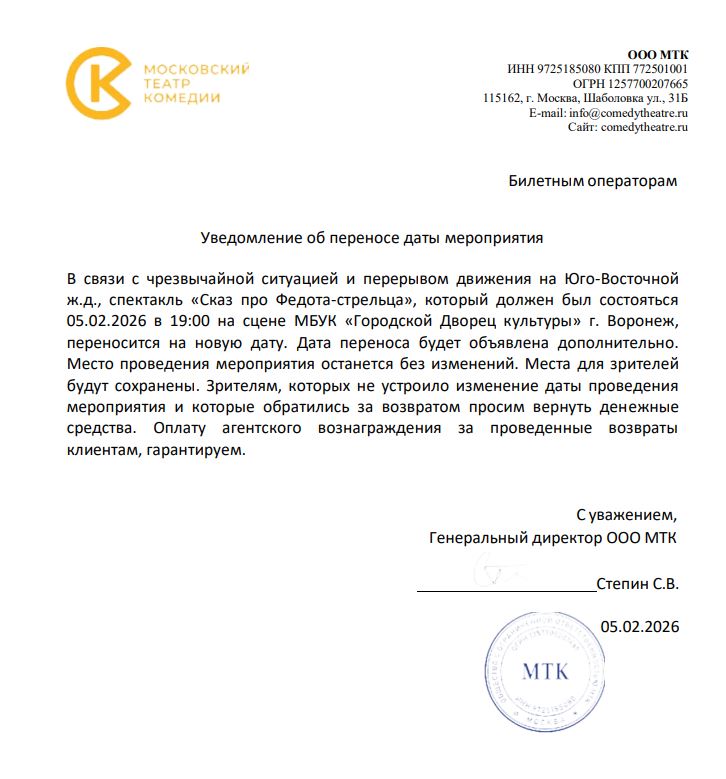 Уважаемый клиент! Спешим сообщить, что по информации, полученной от организатора, спектакль «Сказ про Федота-стрельца», запланированный на 5 февраля 2026 года в 19:00 в Городском дворце культуры, перенесен. Дата и время переноса будет объявлена дополнительно. Ранее приобретенные билеты действительны на новую дату, обменивать их не нужно. Если вам не удобно посетить мероприятие в новую дату, вы можете вернуть билет по кнопке в личном кабинете во вкладке «Заказы». Деньги за электронные билеты вернутся автоматически в полном объёме на карту, с которой была произведена оплата. Если вы купили билет в кассе Ticketland.ru за наличный расчет, то обратитесь, пожалуйста, на почту: vozvrat@ticketland.ru. С уважением, команда поддержки Ticketland.