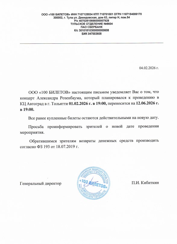 Уважаемый клиент! Спешим сообщить, что по информации, полученной от организатора, концерт Александра Розенбаума, запланированный на 1 февраля 2026 года в КЦ «Автоград», перенесен на 12 июня 2026 года в 19:00. Ранее приобретенные билеты действительны на новую дату, обменивать их не нужно. Если вам неудобно посетить концерт в новую дату, вы можете вернуть билет по кнопке в личном кабинете во вкладке «Заказы» (до 15.03.26 18:00). Деньги за электронные билеты вернутся автоматически в полном объёме на карту, с которой была произведена оплата. Если вы купили билет в кассе Ticketland.ru за наличный расчет, то обратитесь, пожалуйста, на почту: vozvrat@ticketland.ru. С уважением, команда поддержки Ticketland.