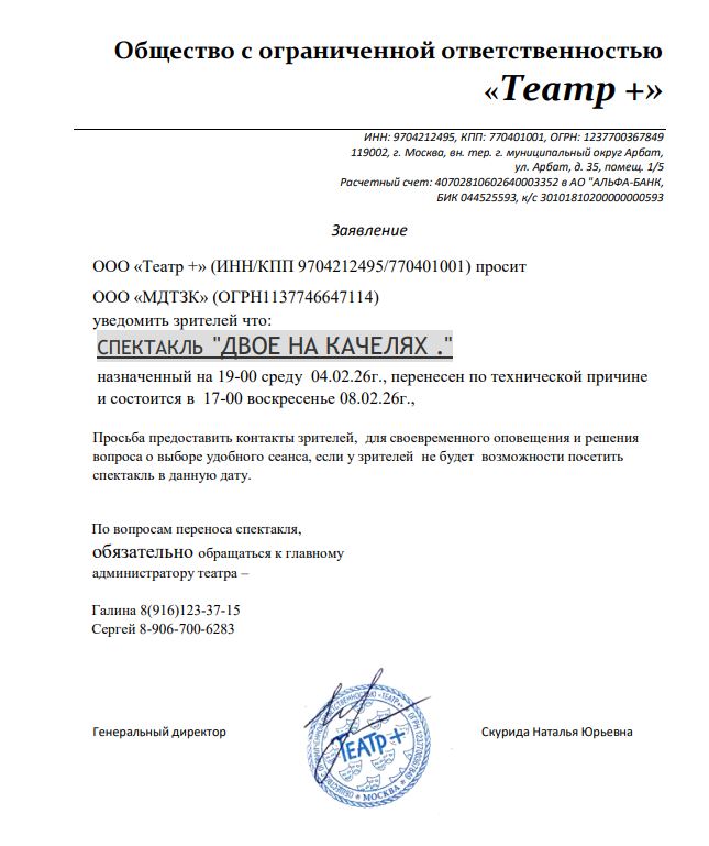 Уважаемый клиент! Спешим сообщить, что по информации, полученной от организатора, спектакль «Двое на качелях», запланированный на 4 февраля 2026 года в 19:00 в «Центральном Доме Актёра», перенесён по технической причине на 8 февраля, начало в 17:00. Ранее приобретенные билеты действительны, обменивать их не нужно. По вопросам возврата билетов обращайтесь, пожалуйста, к главному администратору театра – Галина 8(916)123-37-15, Сергей 8-906-700-6283 С уважением, команда поддержки Ticketland