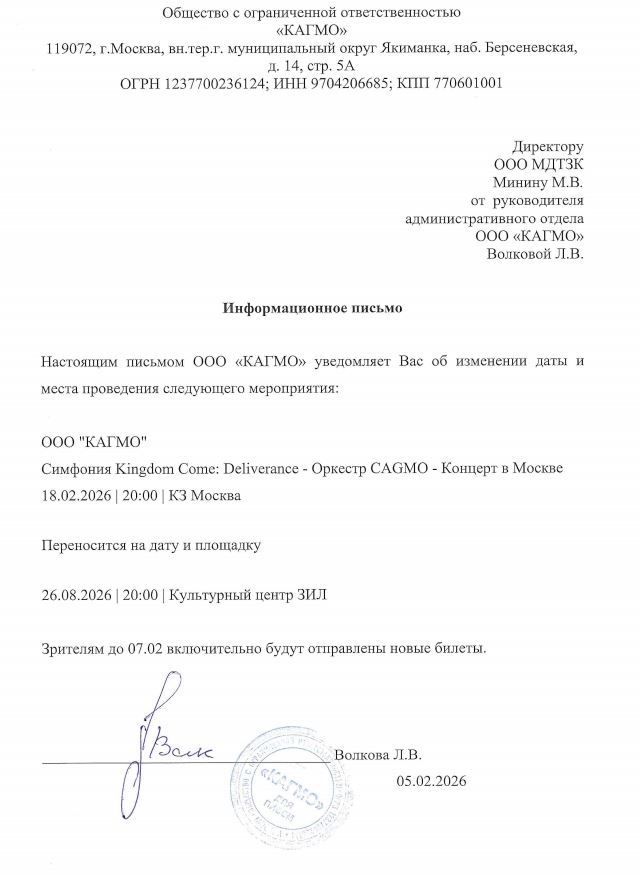 Уважаемый клиент! Спешим сообщить, что по информации, полученной от организатора, концерт «Оркестр CAGMO. Симфония «Kingdom Come: Deliverance», запланированный на 18 февраля 2026 года в КЗ «Москва», перенесен на новую дату и площадку по техническим причинам. Новая дата: 26 августа 2026 год 20:00. Место проведения: Культурный центр ЗИЛ (ул. Восточная, д. 4, к.1). Ранее приобретенные билеты действительны на новую дату, обменивать их не нужно. Если вам не удобно посетить мероприятие в новую дату, вы можете вернуть билет по кнопке в личном кабинете во вкладке «Заказы». Деньги за электронные билеты вернутся автоматически в полном объёме на карту, с которой была произведена оплата. Если вы купили билет в кассе Ticketland.ru за наличный расчет, то обратитесь, пожалуйста, на почту: vozvrat@ticketland.ru. С уважением, команда поддержки Ticketland.