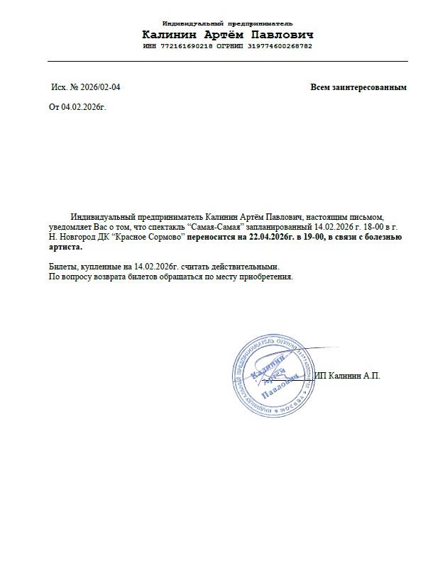 Уважаемый клиент! Спешим сообщить, что по информации, полученной от организатора, спектакль «Самая-самая», запланированный на 14 февраля года в 18:00 в ДК «Красное Сормово», перенесён на 22 апреля 2026 года, начало в 19:00. Ранее приобретенные билеты действительны на новую дату, обменивать их не нужно. Если вам не удобно посетить спектакль в новую дату, вы можете вернуть билет по кнопке в личном кабинете во вкладке «Заказы». Деньги за электронные билеты вернутся автоматически в полном объёме на карту, с которой была произведена оплата. Если вы купили билет в кассе Ticketland.ru за наличный расчет, то обратитесь, пожалуйста, на почту: vozvrat@ticketland.ru. С уважением, команда поддержки Ticketland.