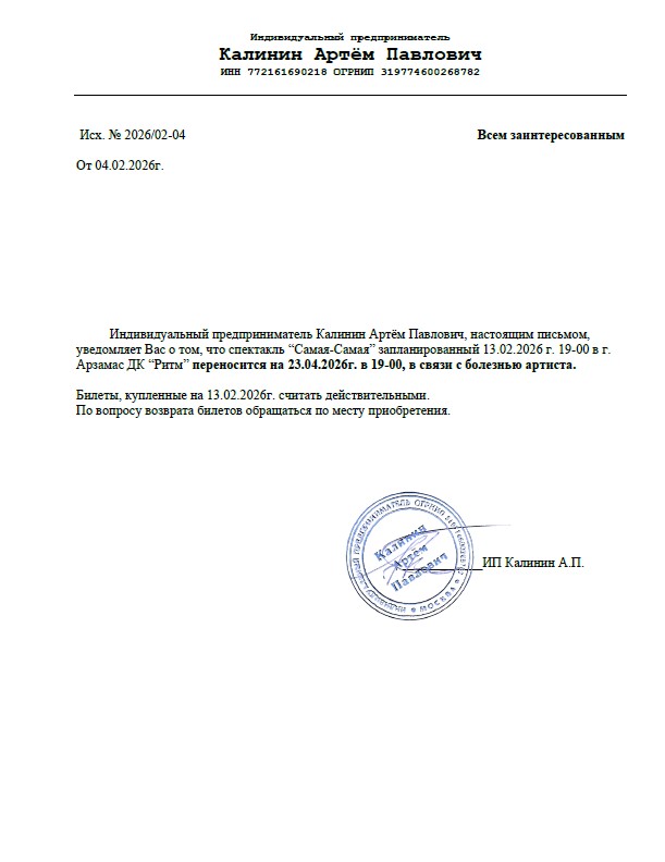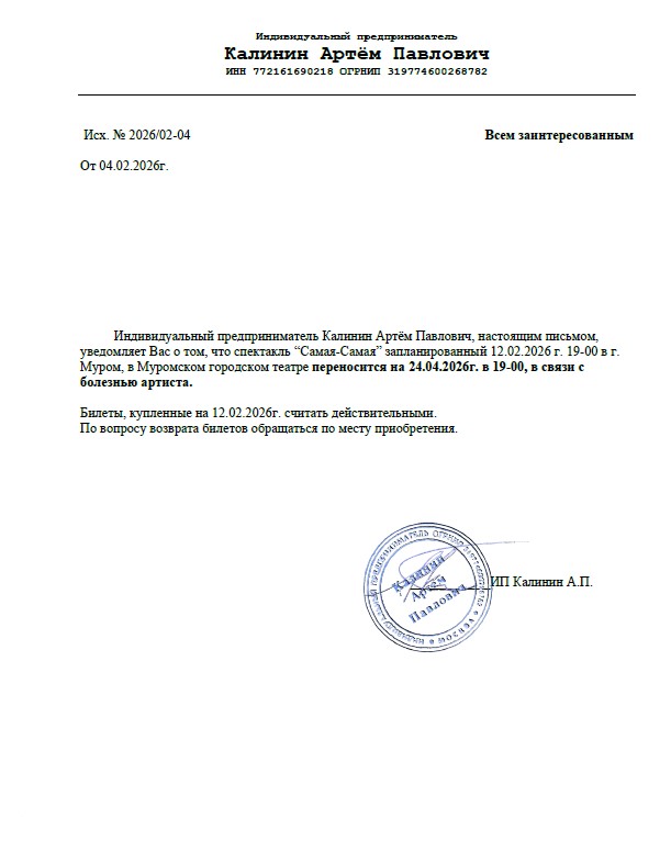 Уважаемый клиент! Спешим сообщить, что по информации, полученной от организатора, спектакль «Самая-самая», запланированный на 12 февраля года в 19:00 в ДК имени 1100-летия г. Мурома, перенесён на 24 апреля 2026 года, начало в 19:00. Ранее приобретенные билеты действительны на новую дату, обменивать их не нужно. Если вам не удобно посетить спектакль в новую дату, вы можете вернуть билет по кнопке в личном кабинете во вкладке «Заказы». Деньги за электронные билеты вернутся автоматически в полном объёме на карту, с которой была произведена оплата. Если вы купили билет в кассе Ticketland.ru за наличный расчет, то обратитесь, пожалуйста, на почту: vozvrat@ticketland.ru. С уважением, команда поддержки Ticketland.